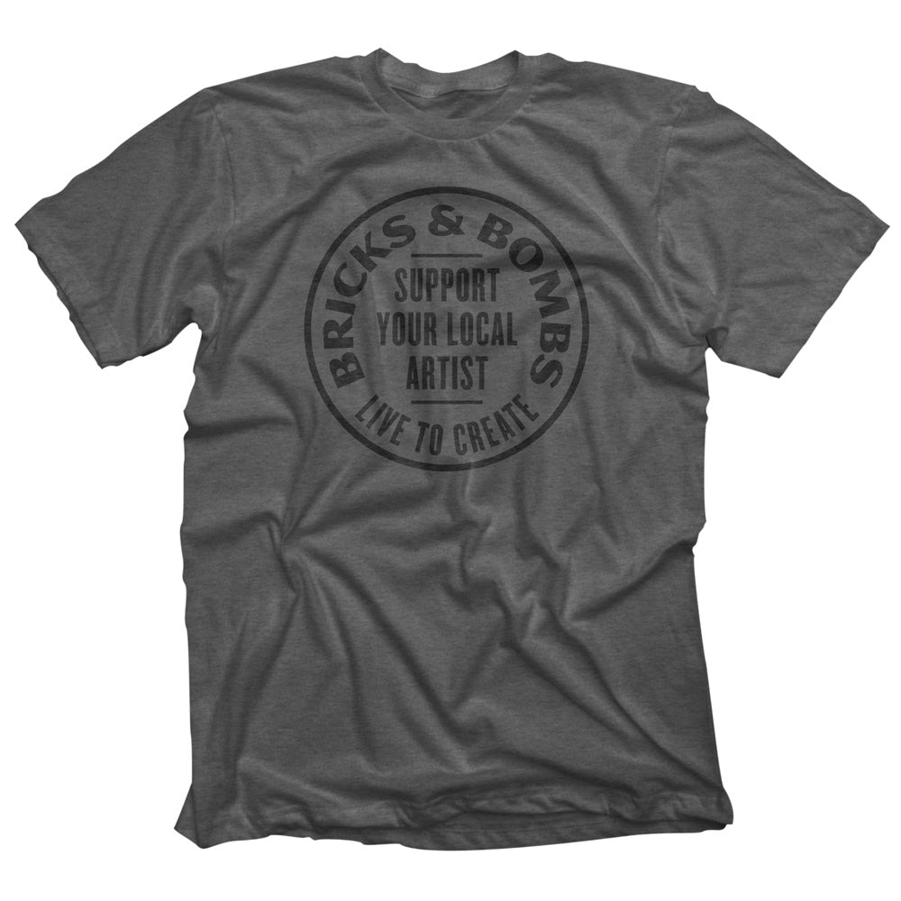 Lightweight 60/40 (Poly/Cotton) blend crew neck T-shirt with the Bricks and Bombs “Support Your Local Artist” graphic screen-printed on the front chest.