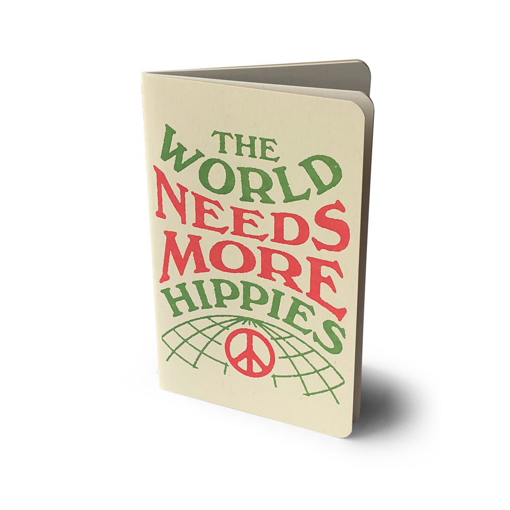 Sketch, doodle, journal, heck keep your grocery list in this blank handmade notebook featuring the “The World Needs More Hippies” graphic letterpress printed on the front.